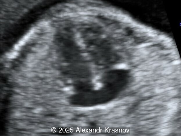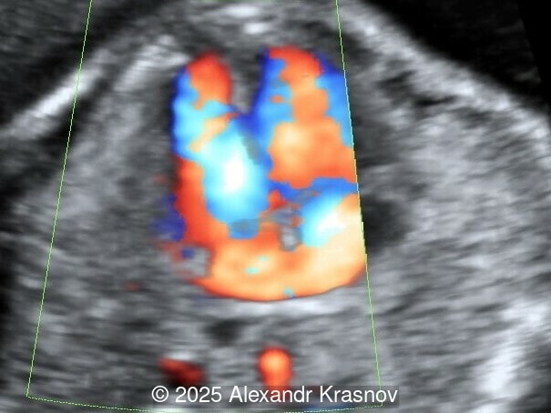 Our ultrasound showed biometry data corresponding to 21 weeks of gestation. During echocardiography, an abnormal drainage of the pulmonary veins was detected in which the pulmonary veins drain into a venous collector linked to the superior vena cava. The four-chamber view and the three-vessel view were altered and raised suspicion of a pathology. The grayscale and color Doppler images of the four-chamber view indicate a smooth posterior wall of the left atrium, increased distance between the left atrium and the descending aorta and the absence of pulmonary veins entering the left atrium (Image 1, 2; Video 1, 2). In the three-vessel view, the diameter of the superior vena cava appears larger than that of the aorta (Image 3, Video 3). In the images of the venae cava, a significant difference is seen between the diameters of the inferior and superior vena cava with significant enlargement of the superior vena cava (Image 4, Video 4). Additionally, there is a pulmonary venous confluent chamber (“twig sign”) behind the left atrium (Image and Video 5). A vertical ascending vein connects the confluent chamber with the superior vena cava where it drains blood from the pulmonary veins (Images 6, 7; Video 6).
