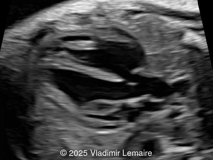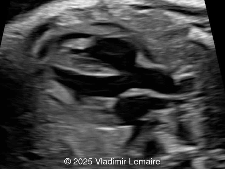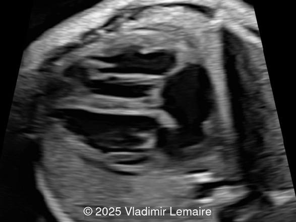 - Image 2: Axial plane of the fetal chest at the level of the four-chamber view. Note the normal appearance of the four-chamber view.