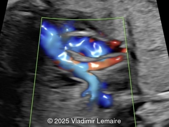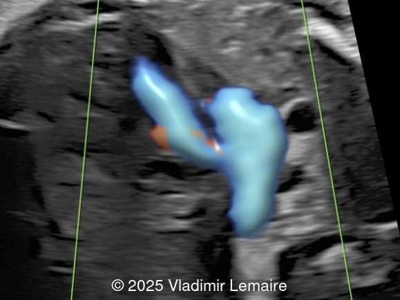 Color Doppler confirms the presence of an overriding aorta with blood draining from both ventricles, through the ventricular septal defect into the aortic root. Due to high perfusion, inflow into the aorta appears aliased. At the level of the three-vessel-trachea view, color Doppler can also demonstrate a small pulmonary artery. Flow is antegrade across the ductus arteriosus in mild Tetralogy of Fallot and can be reversed in severe cases. Color Doppler can help differentiate various subgroups of TOF as postnatal ductal dependency of the pulmonary circulation can be associated with cyanosis of the newborn.
